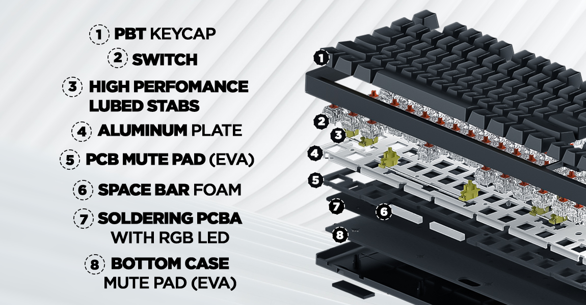Подвійна шумоізоляція з використанням шумопоглинаючої піни з етиленвінілацетату (EVA) забезпечує поглинання зайвого шуму та вібрації при використанні У клавіатурі використовується пластина з анодованого алюмінію, яка надає додатковий антивібраційний захист і, крім того, чудово відображає світло, покращуючи якість підсвічування Змащені вручну преміальні стабілізатори з POM пластику Вбудована пам'ять клавіатури – збережи та грай! 16.8 мільйонів кольорів RGB підсвічування з можливістю налаштування кожної клавіші окремо та п'ятьма рівнями яскравості Програмне забезпечення, що дозволяє створювати та налаштовувати макроси |