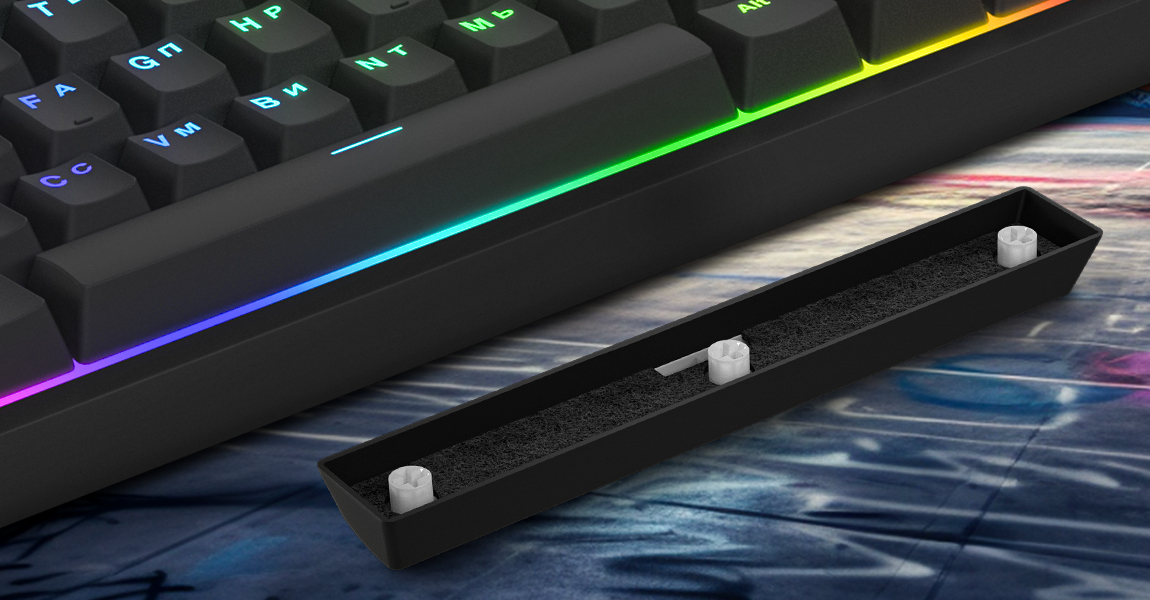 Увага до акустичного комфорту навіть у найменших деталях. Так, традиційно “найгучніша” кнопка у клавіатурах – пробіл, оснащена додатковим шаром звукопоглинаючої піни.